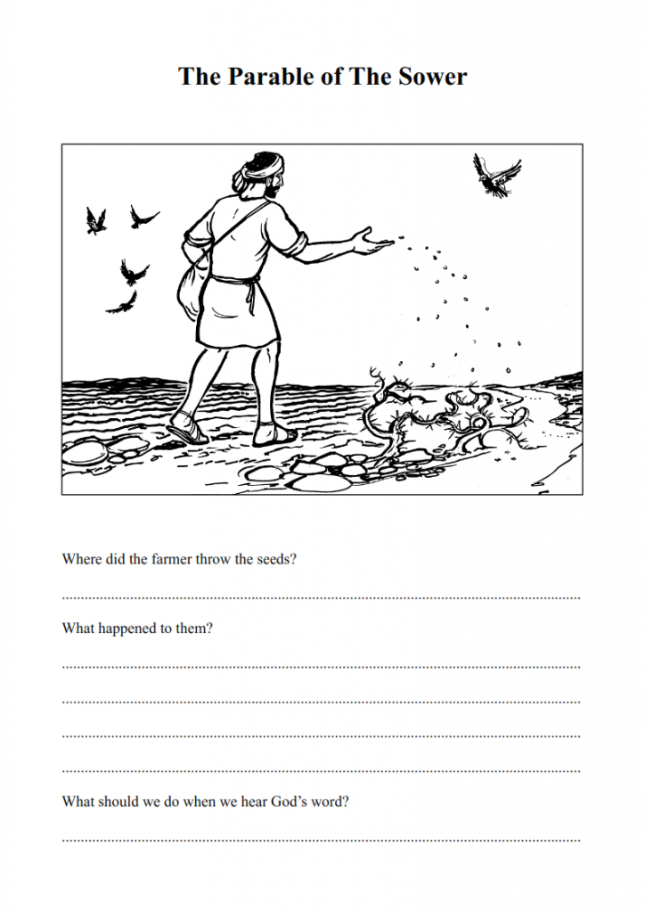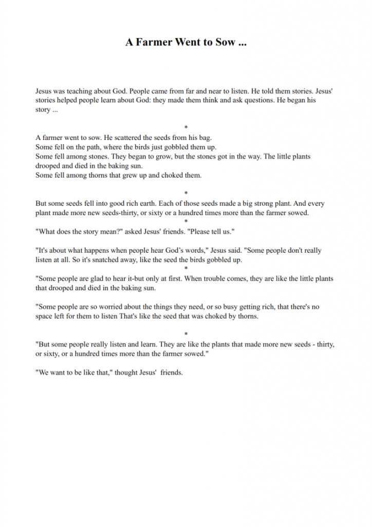 The farmer is like Jesus or someone who teaches about God and the seed is like the message of God. Jesus sows the seeds in different places, and different people react differently to God’s