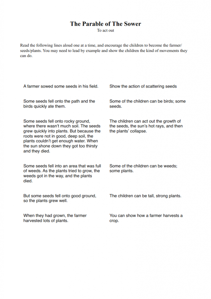 * Tell the story by asking questions. E.g. What do you think happens when seeds fall on rocky ground? Ask the children to retell the story