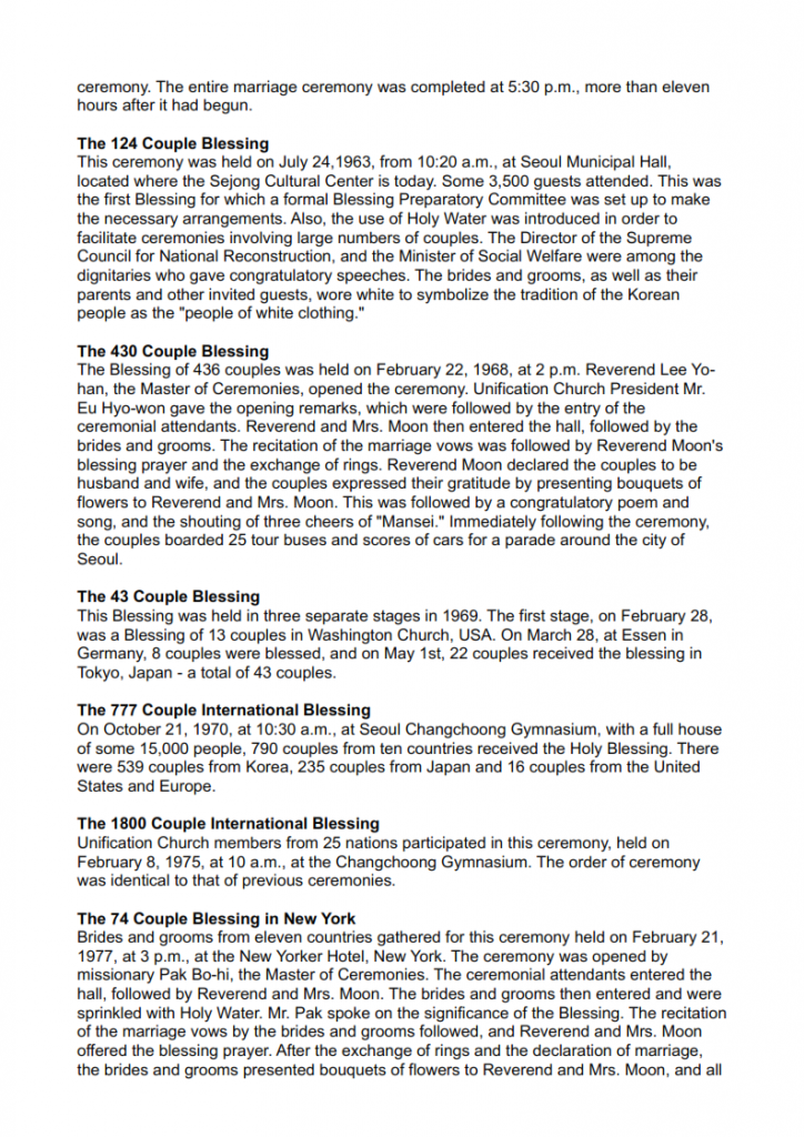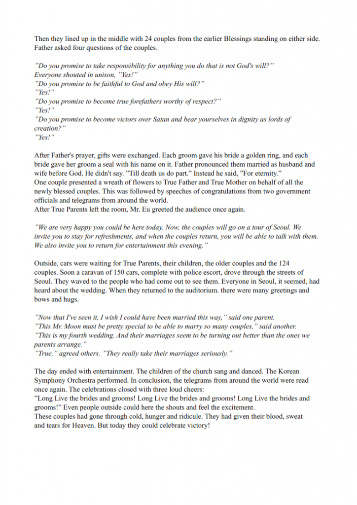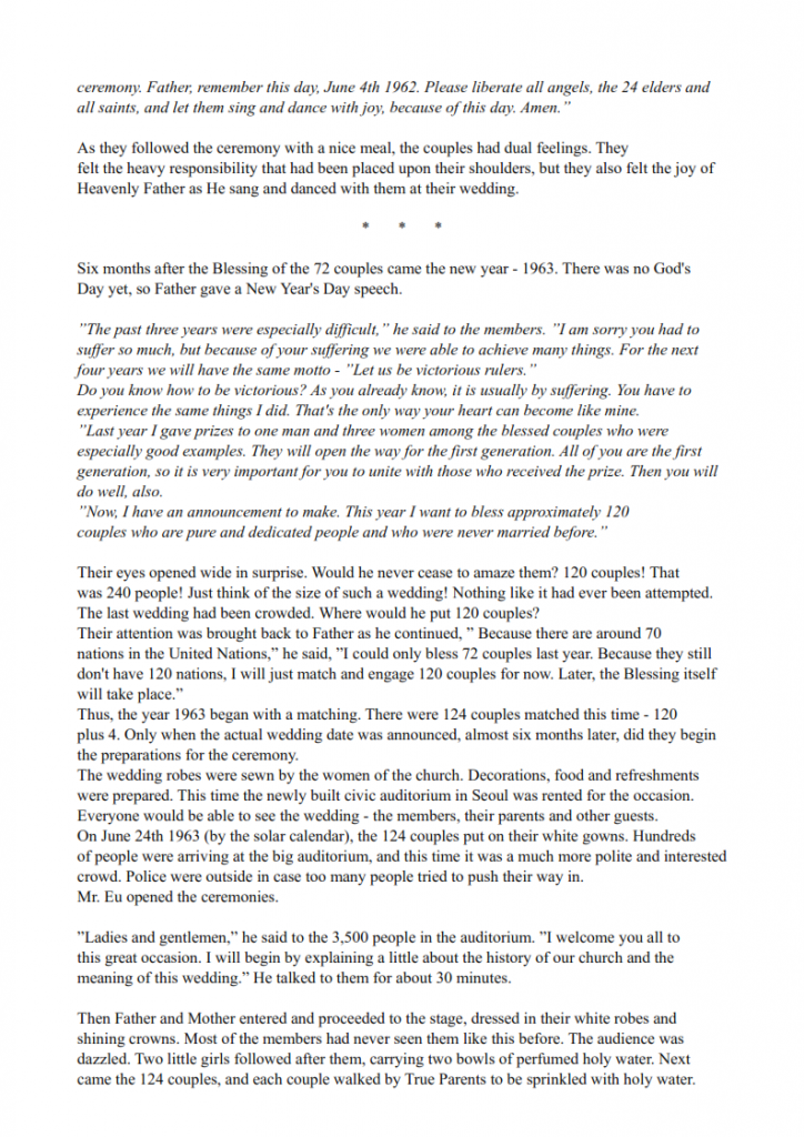 Summary – Father blessed 72 couples in 1962 followed by 124 in 1963. Both were quieter and more joyous than before. The 124-couple blessing had no opposition, and parents were polite and supportive. Even two government officials attended and gave speeches to congratulate the newlyweds. It was great victory for the whole church.