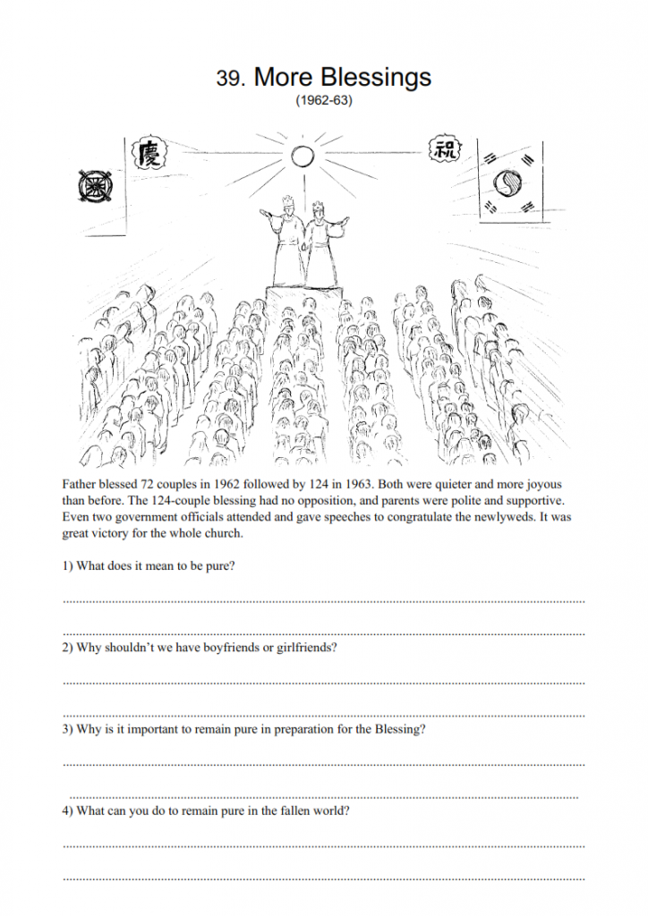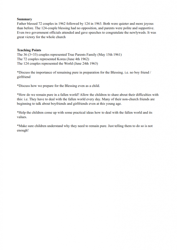 The 72 couples all had to be pure, in order to be qualified for the Blessing. Today it is the same. The condition for the second generation candidates for the Blessing on Father’s 90th birthday, is to be pure – not had boyfriend or girlfriend relationships.