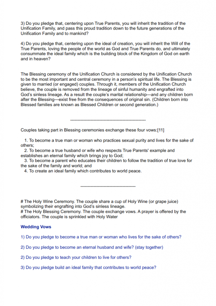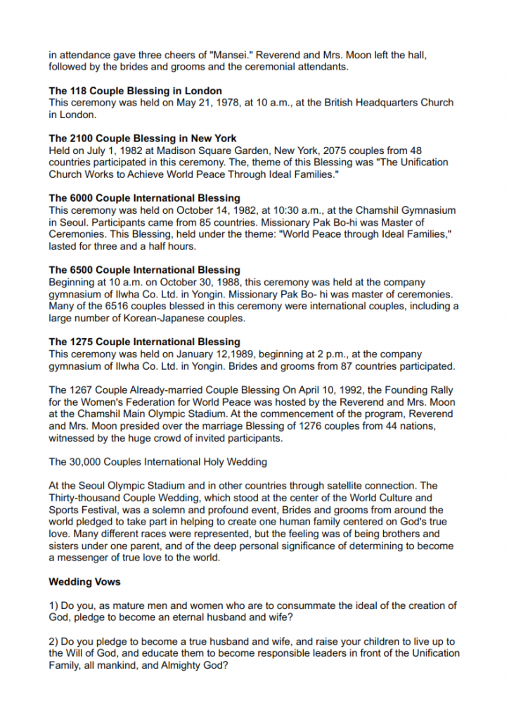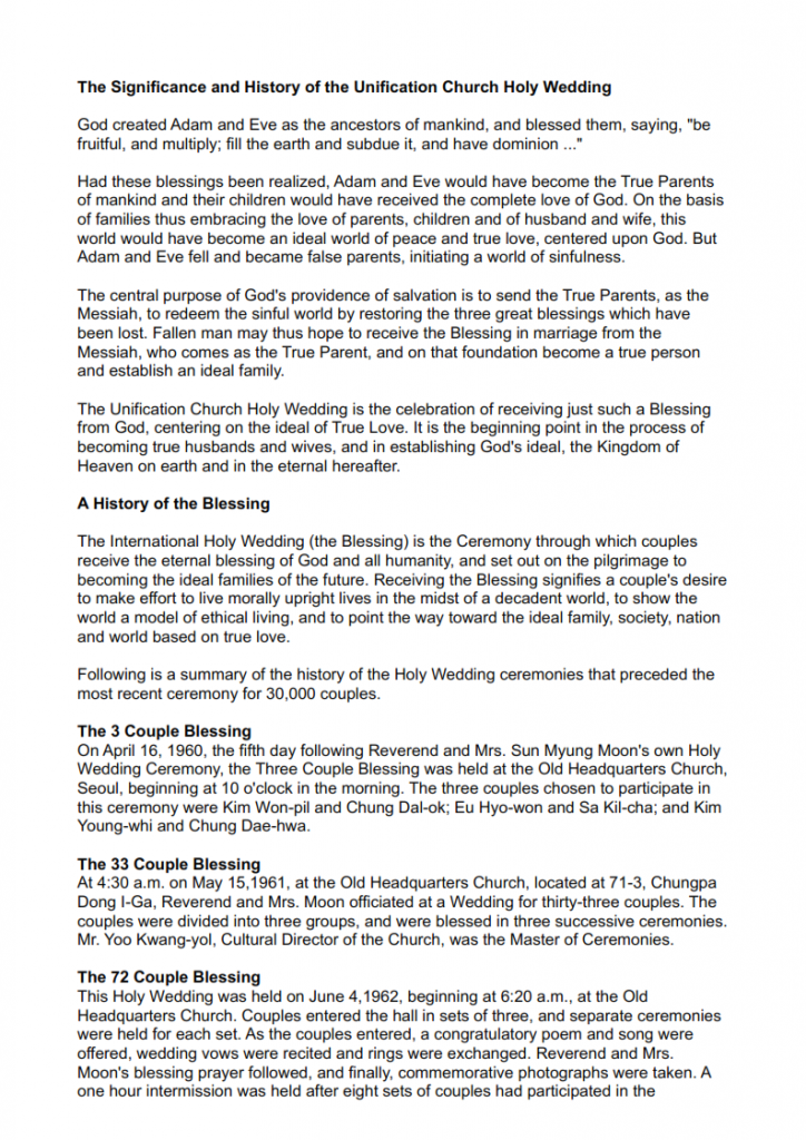 Adam and Eve should have received the Blessing from God. Because of the Fall they became separated from God and all of their descendants have belonged to Satan’s lineage. God chose Jesus to be the second Adam, to restore Adam’s failure, but he died on the cross. With the Blessing of True Parents, they could stand as the restored Adam and Eve and begin a new lineage. Since their Holy Wedding in 1960, many people throughout the world have also been blessed. Through the blessing all people can be separated from the sinful lineage and be engrafted onto God’s lineage, and a new, restored world can begin. The blessing is also eternal, unlike the Christian marriage, which is “until death do us part”
