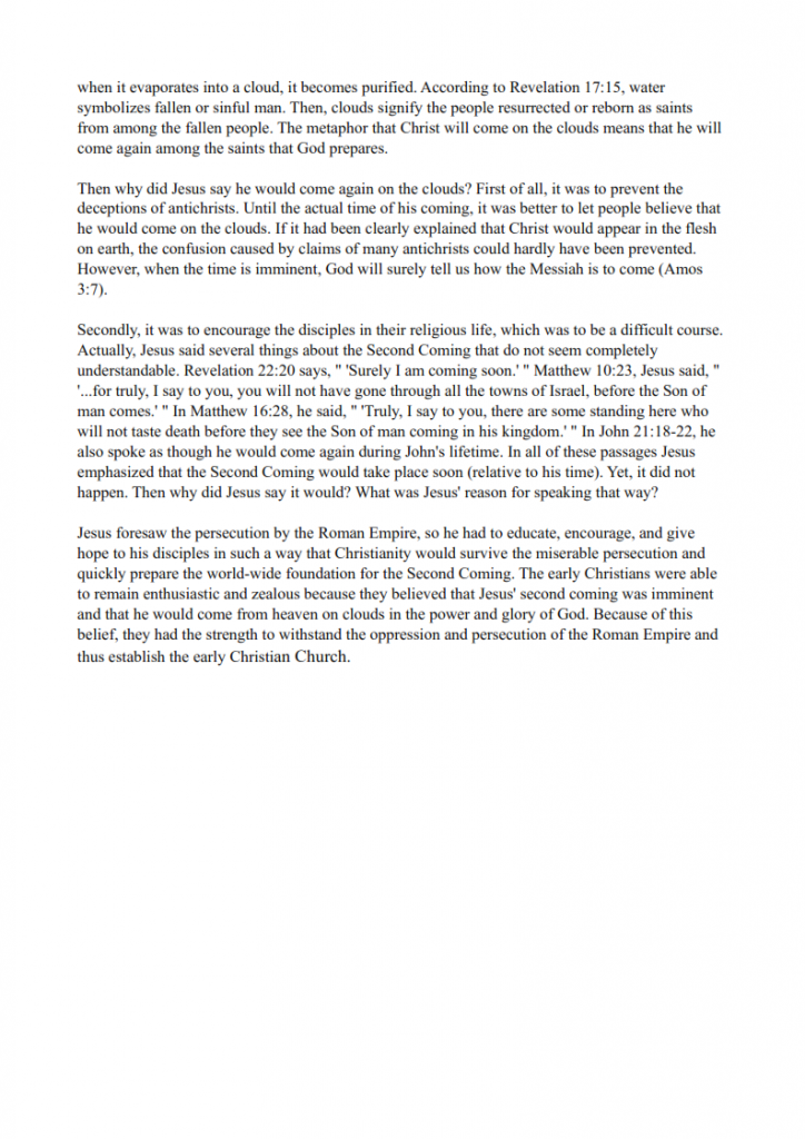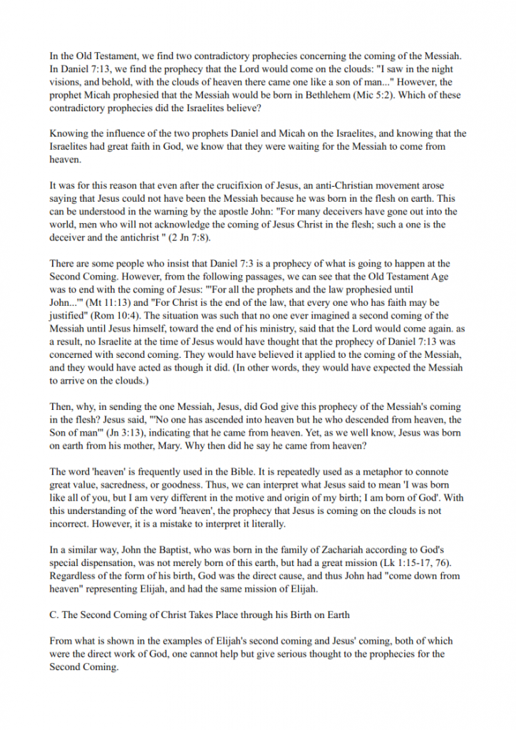 2) If Jesus had made it clear that Christ would be born on earth too may people would be claiming they were the Messiah. God would reveal the truth when the time is right. The explanation of the Principle gives the correct understanding. The second coming of Christ will be a new person born on earth, who has the same mission as Jesus, who comes to complete what Jesus couldn’t finish.